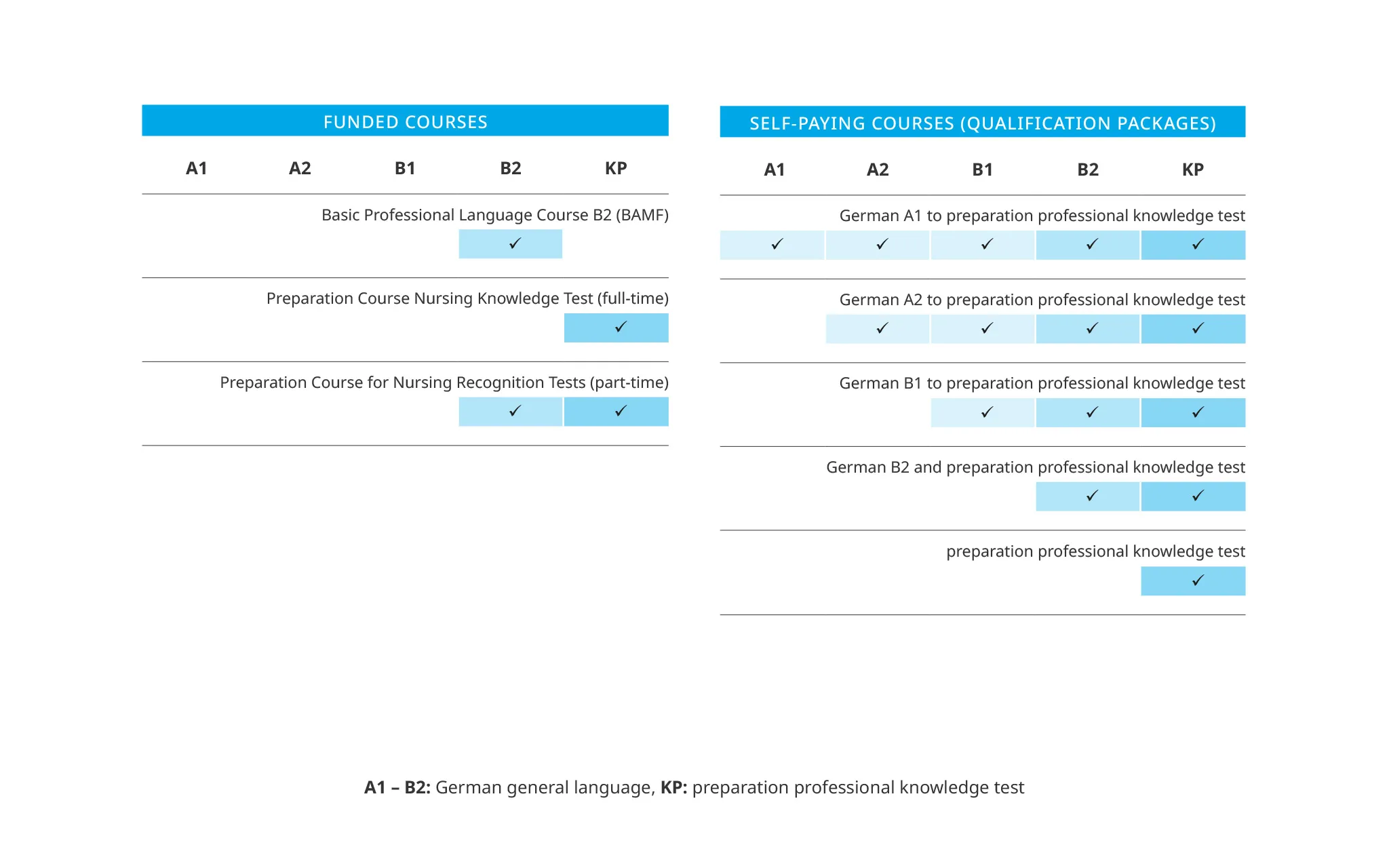 تجمع الدورات المكثفة بين اللغة الألمانية العامة (من المستوى A1 إلى(B2 لاكتساب مهارات اللغة الأساسية، مع محتوى اللغة المهنية، بالإضافة إلى المهارات التمريضية في مجال المعرفة المهنية ذات الصلة، وذلك للتحضير للحياة المهنية وجميع الامتحانات اللازمة للاعتراف.