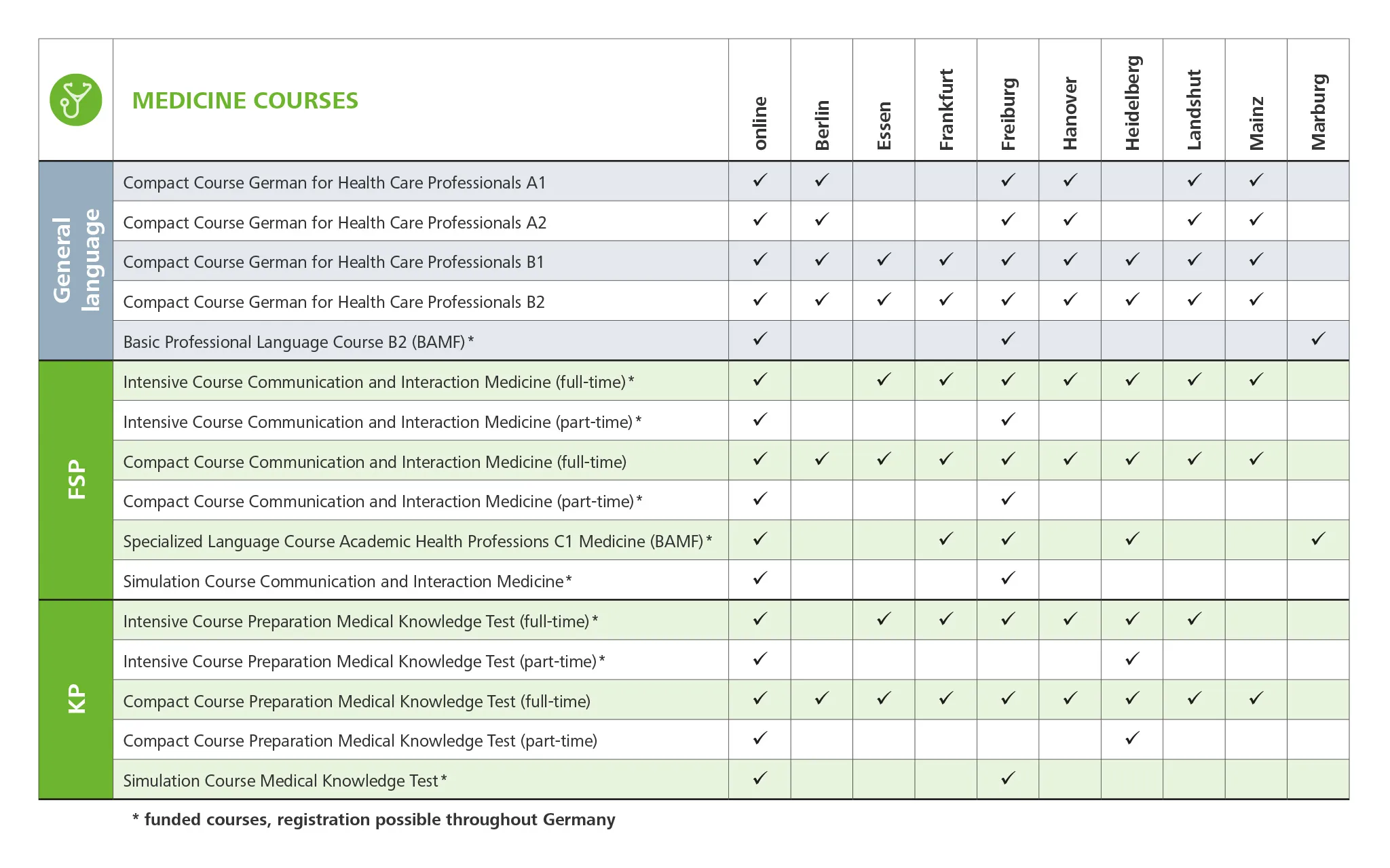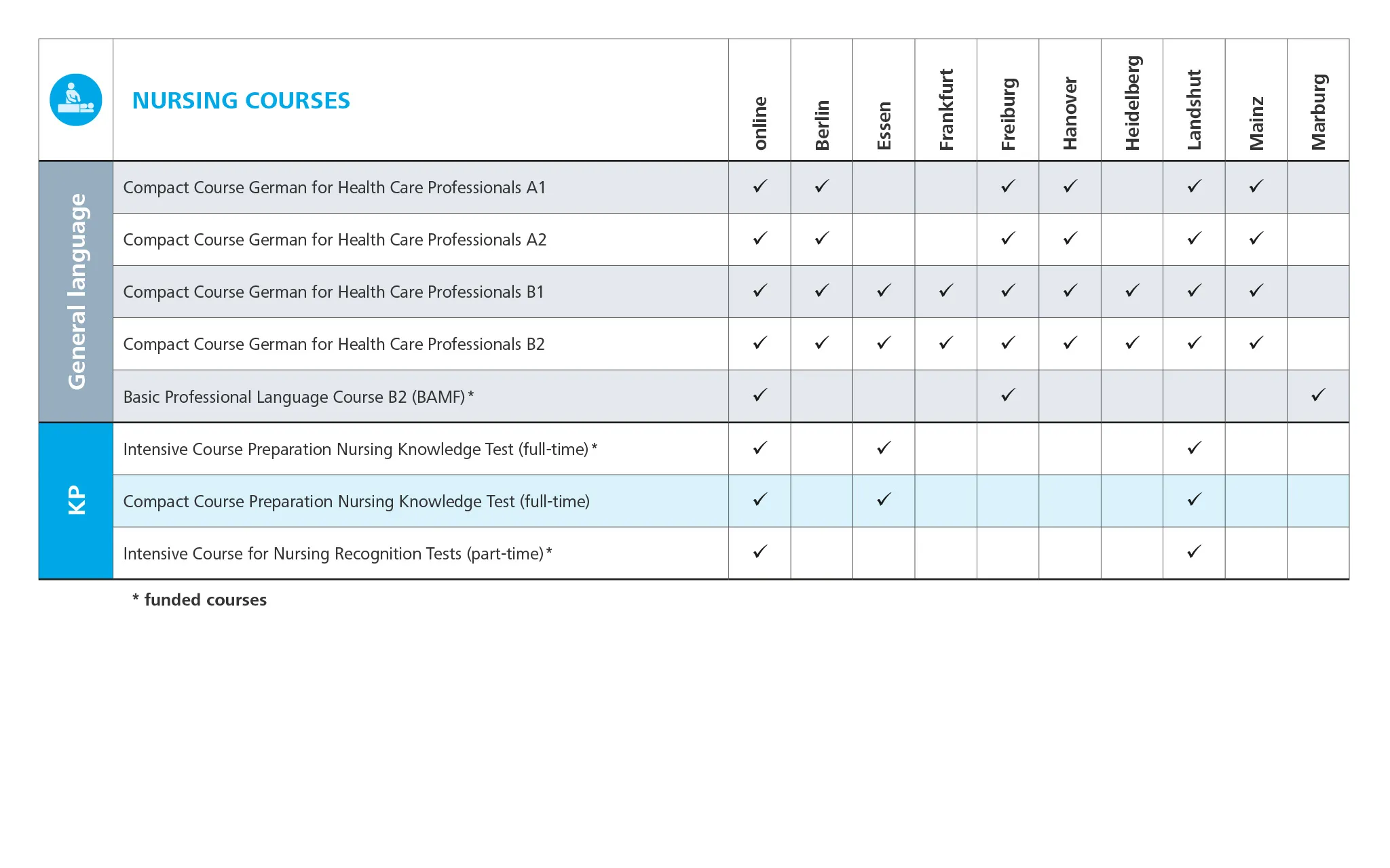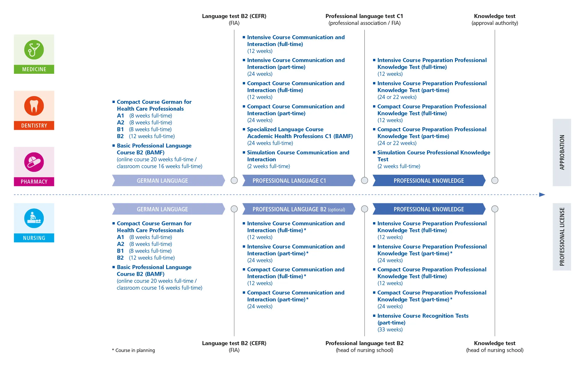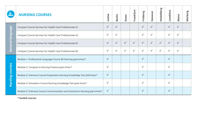 نقدم برامج مختلفة تضم المؤهلات المناسبة لكل مجموعة مهنية، والتي صُممت خصيصًا وفقًا لمتطلبات كل منها. تتكون هذه البرامج من دورات فردية ستعدك على النحو الأمثل لاختبارات اللغة والمعرفة الطبية المطلوبة لمنح الترخيص المهني للاعتراف بمهنتك.