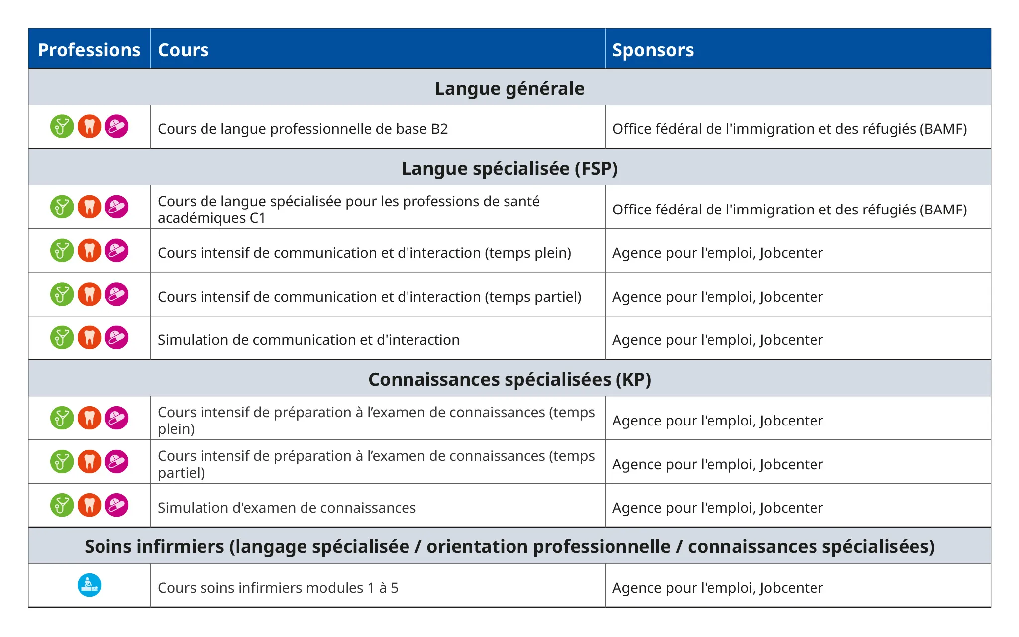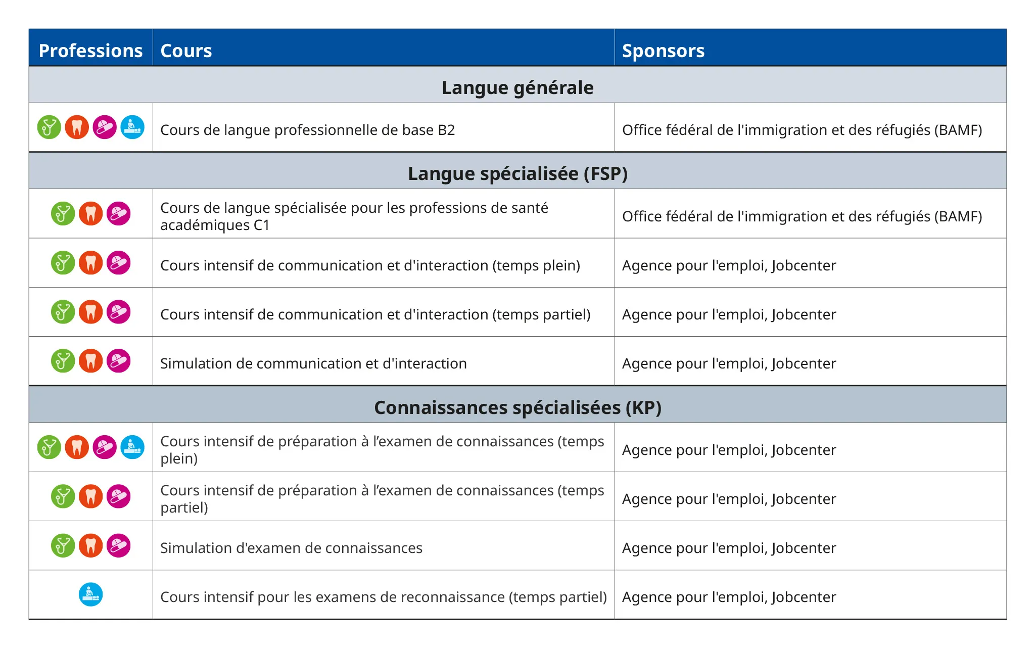 La FIA offre des cours certifiés AZAV pour la langue et les connaissances professionnelles, qui sont financés (payés) par différents sponsors. L'inscription à tous les cours financés est possible dans toute l'Allemagne. Les sponsors suivants peuvent couvrir les frais de ces cours :